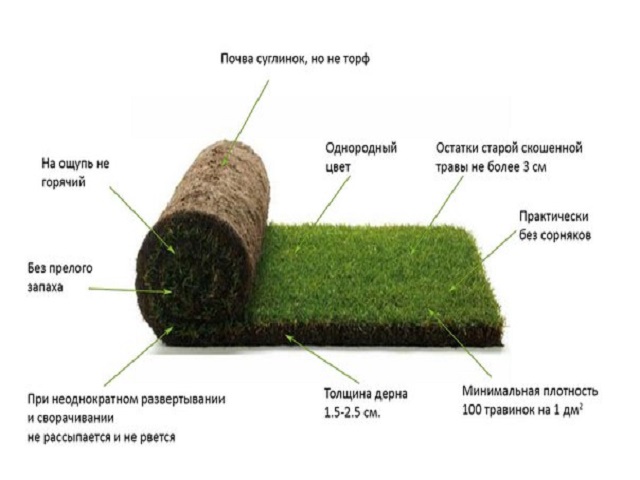 Профессионально выращенный рулонный газон практически не имеет сорняков, имеет густой и насыщенный травяной покров, не имеет проплешин. Рулонный газон бывает разных видов по своему составу: Универсальный рулонный газон (мятлик луговой 50%, овсяница красная 35%, райграс пастбищный 15%); Спортивный рулонный газон (мятлик луговой 90%, райграс 10%); Премиум рулонный газон (мятлик луговой 100%); Партерный рулонный газон (мятлик луговой 40%, овсяница красная 40%, райграс многолетний 20%).